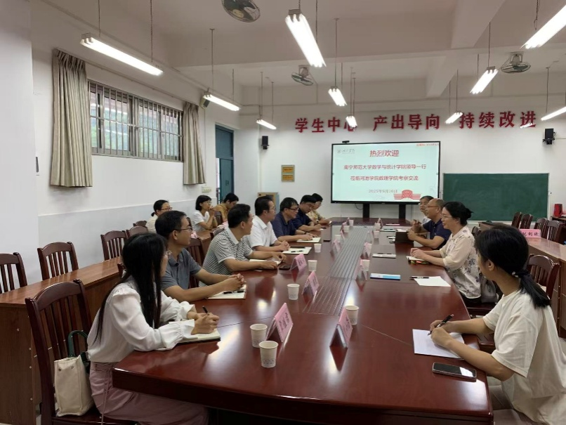 为了落实《自治区教育厅关于开展2023—2025年广西普通本科高校对口支援工作的通知》等文件精神,2025年9月26日,BWIN必赢院长黄在堂教授、副院长韦扬江教授、院长助理杨剑锋教授以及统计金融系主任杨燕副教授、韦宏副教授一行五人,专程赴河池学院数理学院开展考察交流活动。河池学院数理学院党委书记罗日才、院长韦玉程及学院相关代表共同参与座谈。