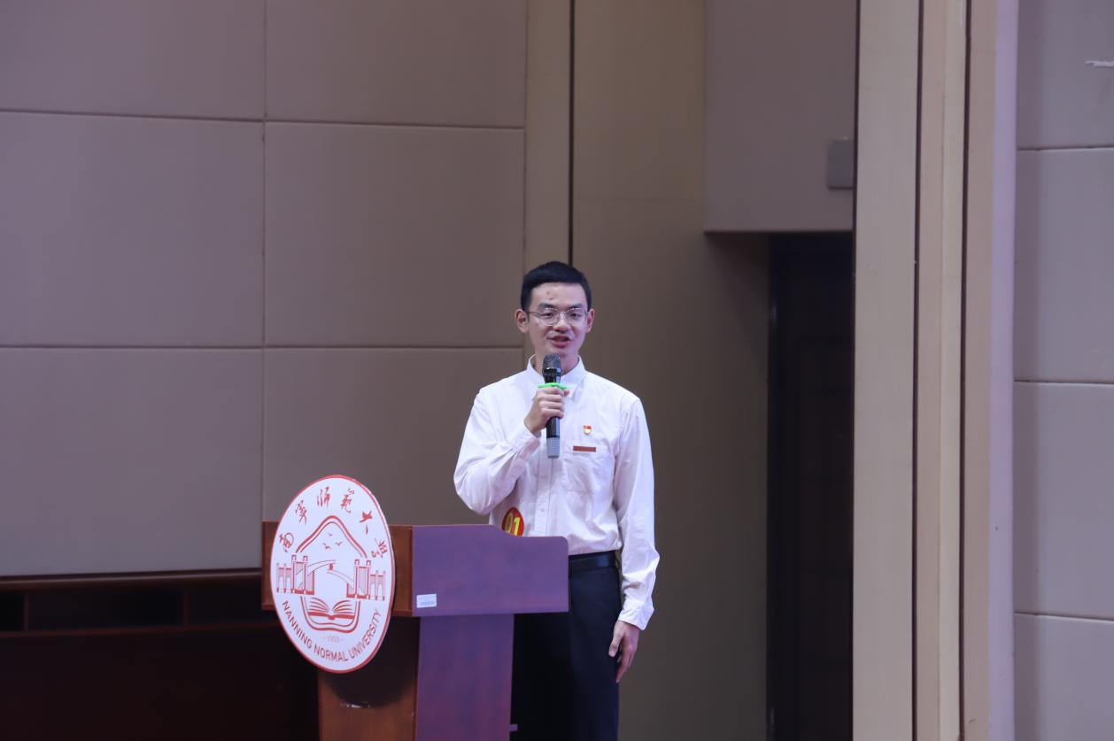 备赛期间,学院学工办聚焦理论贴近青年,组织力量与卢若楷共同打磨内容。宣讲以抗战胜利80周年为切入点,结合昆仑关战役历史印记,联动广西作为中国-东盟合作桥头堡的区位优势,融入平陆运河建设、中国—东盟人工智能产业园等在地实例;同时紧扣校园场景,号召不同专业学生立足所长践行使命,提及本校“小青芒”志愿者服务东盟博览会的实践,让宏大主题落地青年生活。