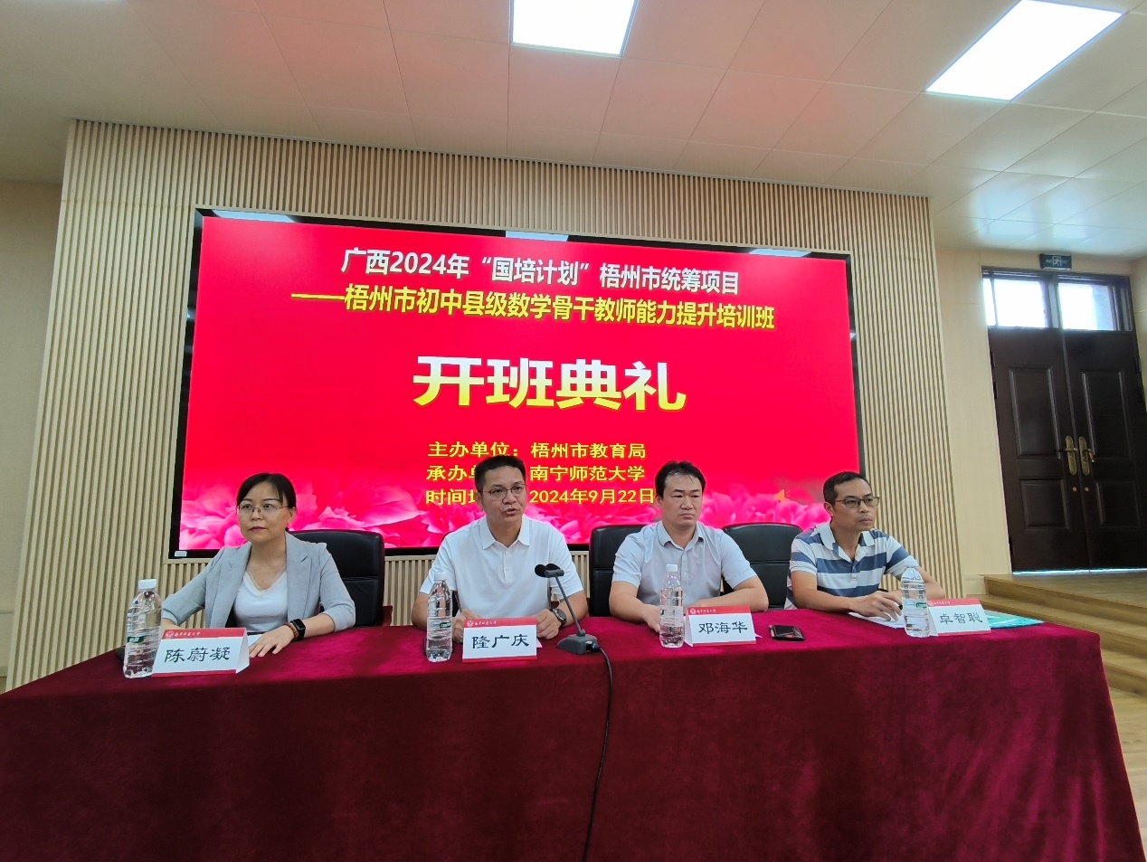 9月22日,由梧州市教育局主办、BWIN必赢承办的2024年“国培计划”梧州市统筹项目——梧州初中县级数学骨干教师能力提升培训班顺利开班。学校党委副书记隆广庆,梧州市教育局党组成员、副局长邓海华,梧州市教师培训中心主任卓智聪,以及来自梧州市的70位初中数学骨干参加了此次培训班开班典礼。仪式由班主任陈蔚凝老师主持。