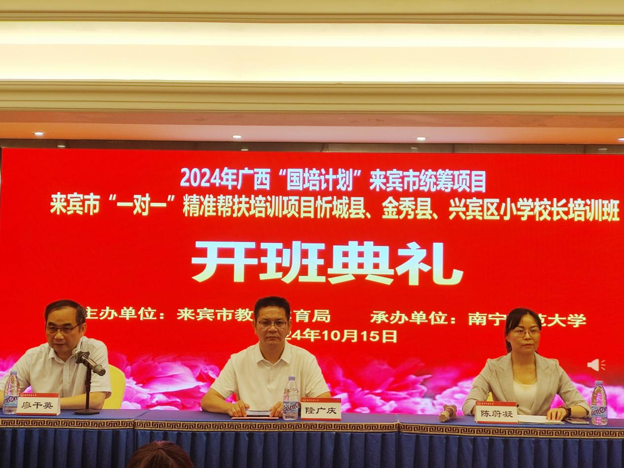 10月15日,由BWIN必赢承办的2024年“国培计划”来宾市统筹——来宾市“一对一”精准帮扶培训项目——忻城县、金秀县、兴宾区小学校长培训班在南宁顺利开班。BWIN必赢十分重视本次培训,在各方面做出了精心的准备。BWIN必赢党委副书记隆广庆教授、来宾市教育体育局教师培训中心廖干英主任出席了开班典礼。来自来宾市忻城县、金秀县、兴宾区的66位小学校长、副校长参加了此次培训。