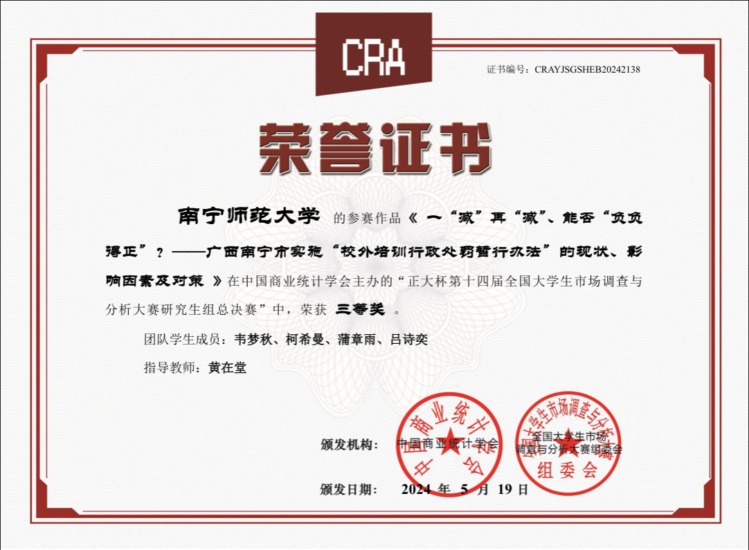 由中国商业统计学会、全国大学生市场调查与分析大赛组委会主办的第十四届全国大学生市场调查与分析大赛已圆满落下帷幕。本次大赛于 2023年9月启动,吸引了全国1063所高校,29.5万名大学生报名参赛,经过理论知识赛、校赛、省赛的层层选拔决出各奖项。在本次大赛中,我校学子积极参与,围绕社会和经济问题开展调查研究,通过精准定位以小见大,运用所学知识进行深入探讨和分析,给出有意义的结论和建议。我校参赛队共获得本科组国家三等奖1项、广西一等奖1项、二等奖9项和三等奖2项;研究生组获得国家三等奖1项、广西一等奖3项、三等奖3项。