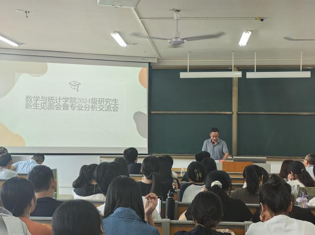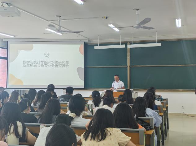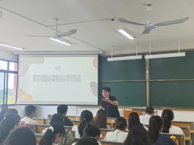 在会议中,学科数学专业负责人韦扬江教授从学科教学(数学)的培养方案的角度,与同学们分享数学课程与数学教学规律,并提出了培养的要求,所培养的同学应具有良好的政治素养、比较扎实的数学教育理论基础,了解本学科的进展与动向,有较系统的专业知识。基础数学专业负责人邓贵新教授介绍了基础数学方向的基本培养方案和相关研究方向。他鼓励研究生们在接下来的学习中,认真钻研专业知识,勇于创新,争取取得优异成绩;应用数学专业负责人靳鲲鹏博士介绍了应用数学方向的一些课程学习与安排,提出了相应的要求,并希望同学在科研道路路上越挫越勇,取得更大的进步;概率论与数理统计专业负责人杨剑锋教授与大家分享了概率论与数理统计的培养方案,介绍该专业的学习平台,未来研究方向的选择,还有就业方向等,给同学们专业学习提供了重要的参考;计算数学方向麦雄发副教授介绍了计算数学的主要内容和发展方向,鼓励学生读研的路上要坚持不懈,认真对待学习和生活,寻找适合自己的运动方式并养成规律锻炼的好习惯,学会排解情绪。做到既要认真科研,也要身心健康,三年后成为德智体美劳全面发展的新时代青年;