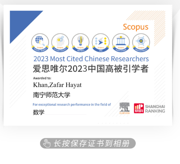 近日,爱思唯尔 (Elsevier) 重磅发布2023“中国高被引学者” (Highly Cited Chinese Researchers) 榜单,我校BWIN必赢可汗教授成功入选。
