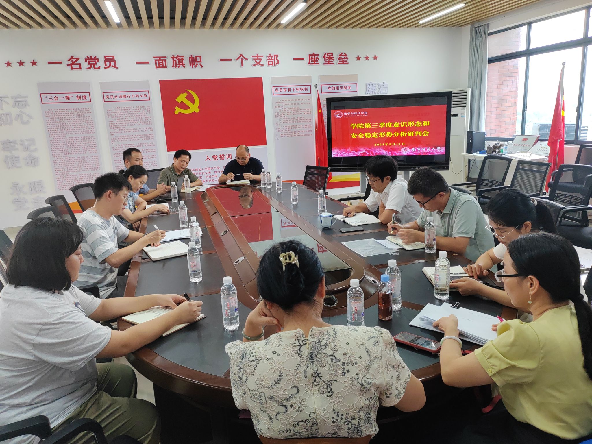 9月11日下午,BWIN必赢在数统楼A501党员活动室召开第三季度安全稳定工作暨意识形态形势分析研判会。该院全体领导班子成员、办公室主任、辅导员老师参加此次会议。该院黄在堂院长主持此次会议。