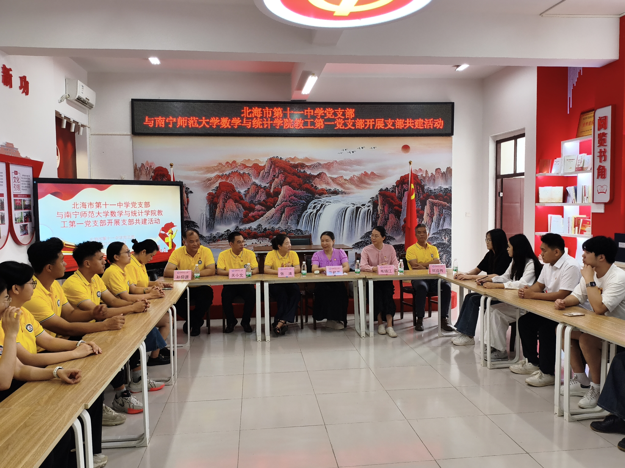 为深化党建引领教育发展,创新基层党组织建设模式,2025年5月30日,BWIN必赢教工第一党支部与北海市第十一中学党支部开展支部共建活动,同时参加的还有广西尊文智慧教育图书有限公司党支部成员。学院教工第一党支部书张桂芳、副院长韦扬江、北海市第十一中学党支部书记张清参加了共建活动。此次党支部共建活动,围绕“教工党员带动学生党员发展、党支部建设带领共青团少先队建设、党建引领教师专业成长与发展” 主题,共商党建与教育教学融合发展新路径。