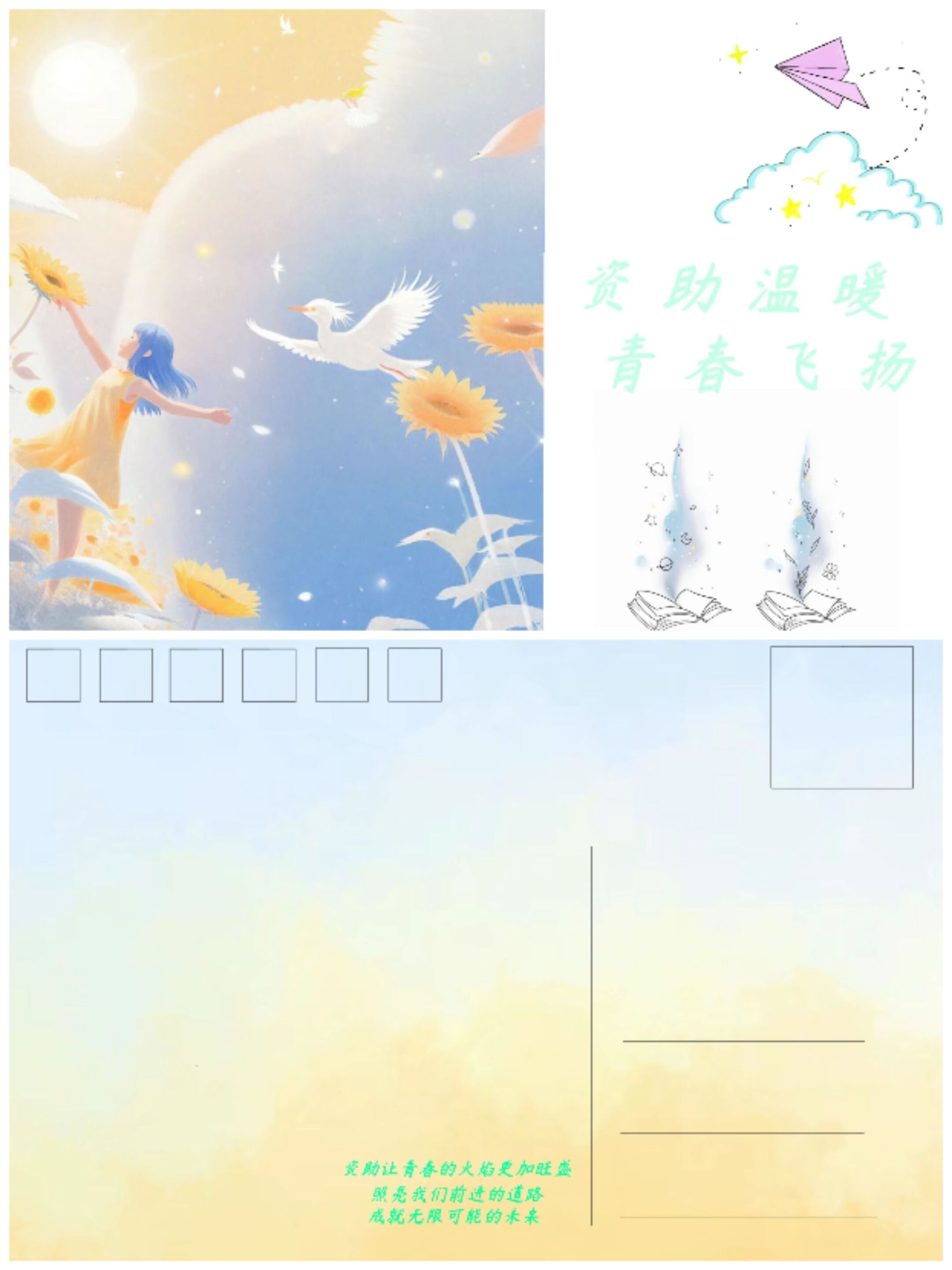 活动期间,同学们踊跃参加,参赛的作品内容丰富、形式多样,画面主题鲜明,这些精美的明信片设计展现出了对国家资助政策和活动主题的深刻理解。本次比赛共收到110件作品,经对作品主题内涵、版面设计、艺术价值、创新性等多方面的评选,最终2022级统计班邹丽莎同学获得第一名。