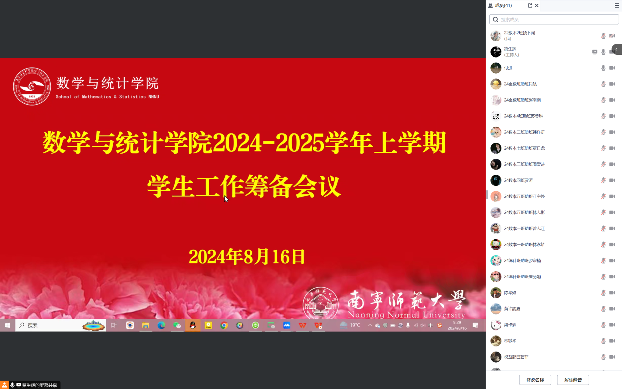 会上,各部门依次汇报了假期工作及新学期工作计划。随后,何振飞老师对该院新生军训工作进行通报,强调军训期间的安全注意事项;林敏华老师对新生资助相关工作的开展进行布置;第生辉老师围绕新生身份核验、新生报到注意事项、反诈防骗宣传工作进行了强调,并希望学生骨干能够发挥好榜样作用,在实践中不断提升自我;梁卡霖老师指出,本次会议吹响了新学期的集结号,2024级各班助班以及团委学生会各部门要以饱满的热情做好迎新工作,有组织有纪律,服从组织安排,高质量完成各项工作,在迎新工作中展现出良好的精神面貌。最后,付进副书记总结时强调,一是要高度重视迎新工作,全方位落实各项保障工作,营造家的温暖,给新生们留下美好的第一印象。二是要明确分工,细化落实,要加强工作人员培训,熟悉各项工作内容,保持良好沟通,增强纪律意识,认真履职尽责,帮助引导新生熟悉校园、适应大学生活。三是要统一思想,团结协作,以饱满的精神状态开展迎新工作,通过一个活动锻炼一批人,朝着既定的工作目标努力奋进,抓实抓细迎新各项工作,为新学期各项工作开好头、起好步。