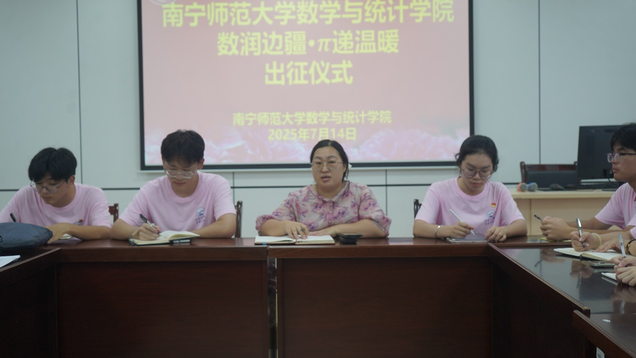 出征仪式上,实践服务队队长廖阳阳同学首先汇报了团队筹备情况与实践计划。她介绍,团队将带着精心准备的数学科普课程、边境儿童关爱礼包,前往广西崇左市宁明县那楠乡那楠中心小学开展为期7天的志愿服务。“我们将以宣传卫国戍边精神为目标,用专业能力服务边境群众,用实际行动传承戍边精神!”