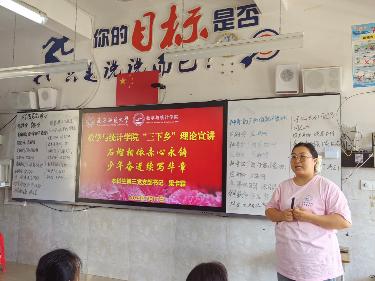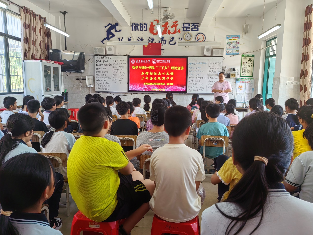 为深入学习贯彻习近平总书记关于青年工作的重要思想,弘扬民族团结精神,传承红色基因,在小学生们心中播下“红色种子”,7月17日上午,BWIN必赢2025年暑期“三下乡”社会实践活动“派克・π出发”实践服务队,于广西崇左市宁明县那楠乡那楠中心小学,开展了一场意义非凡的“石榴相依赤心永驻,少年奋进续写华章”主题理论宣讲活动。此次活动近60名学生踊跃参与,特别邀请到学院团委书记(本科第三党支部书记)梁卡霖老师担任宣讲人。