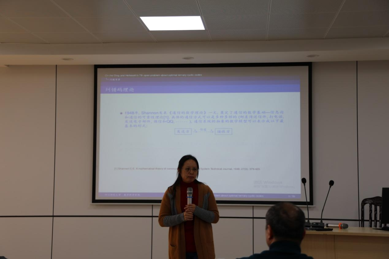 在报告中,唐高华教授介绍了quasi-clean环、quasi-交换环等定义,并给出了相关的几个定义证明推理。苏华东教授介绍了单位图的周长、直径、平面性等不变量的定义及其证明。李永雄博士通过具体例子的讲解,介绍椭圆曲线的基本知识、L函数的算术以及相关的应用。廖群英教授介绍了纠错码原理、线性码、三元最优循环码等基础理论,Ding和Helleseth的第七个公开问题的研究现状及相关研究成果及证明。赵伟副教授介绍了数学的世界观和数学的方法论,要用数学的思维方式待数学,要学会由“殊途同归”到“殊途同类”,以“殊途同类”引领数学的创新。
