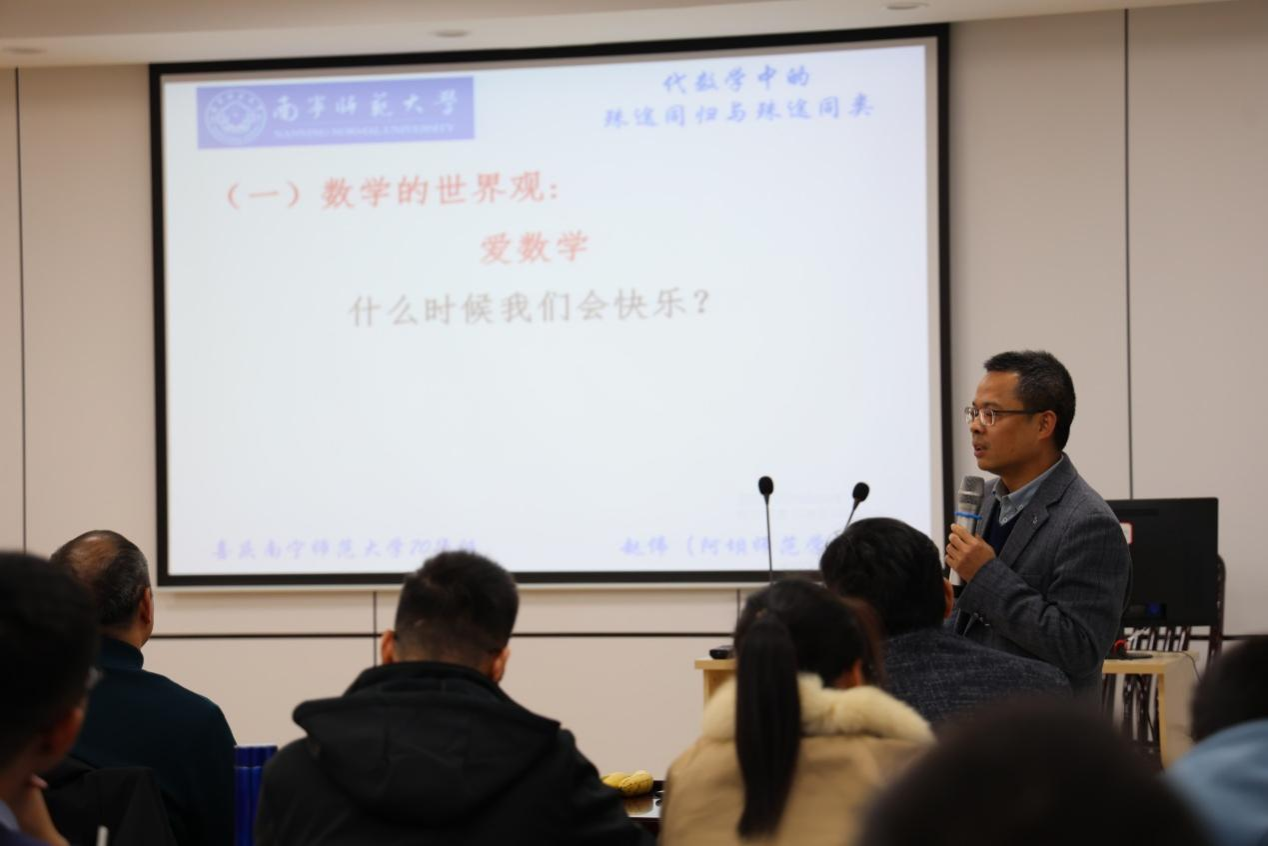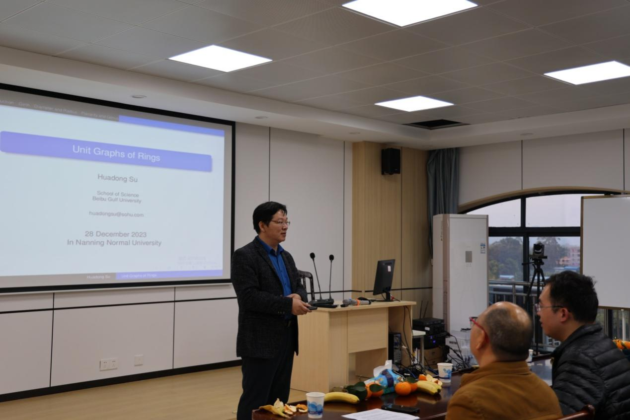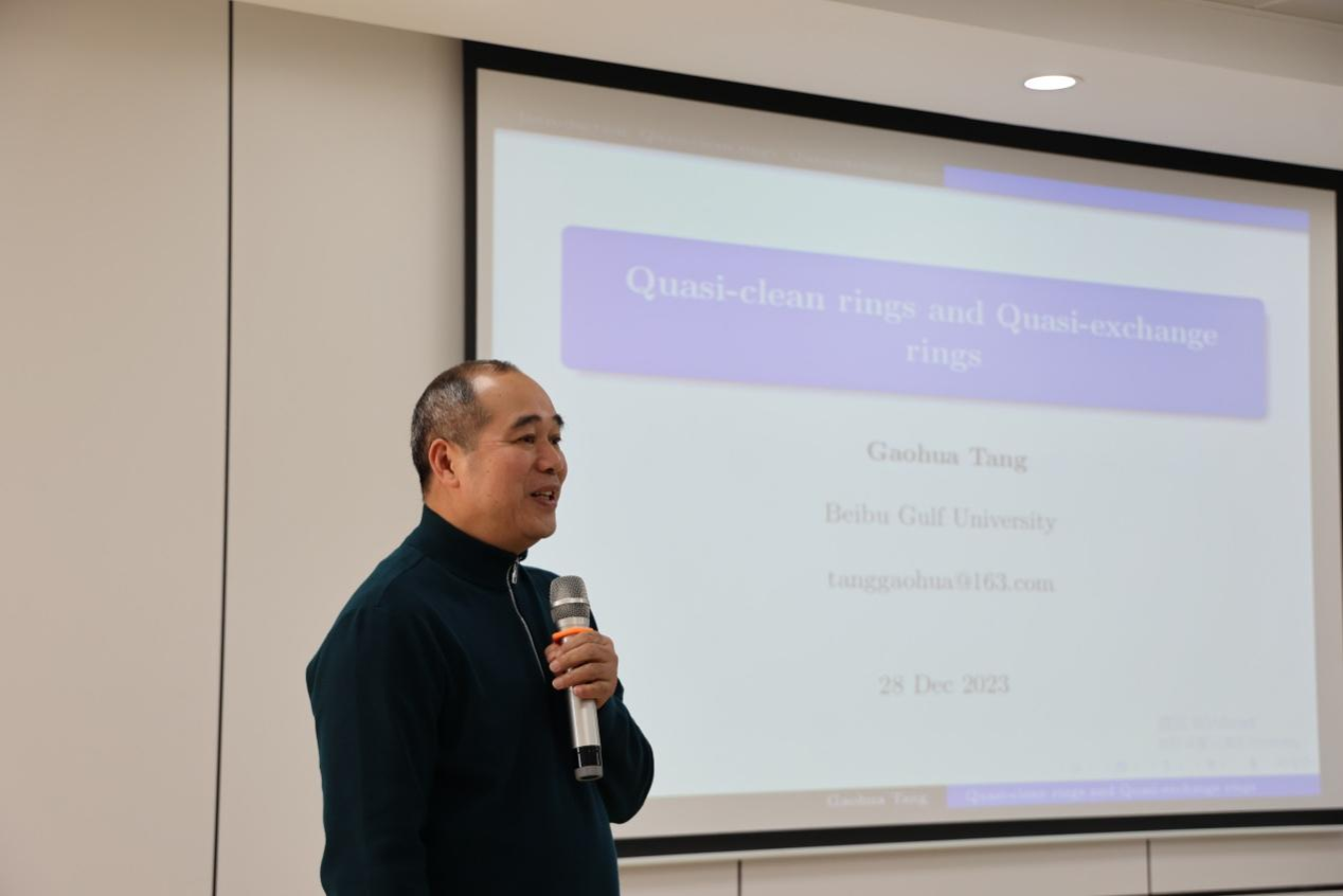 2023年12月28日,应我校BWIN必赢的邀请,北部湾大学唐高华教授、苏华东教授,清华大学李永雄助理教授,四川师范大学廖群英教授,阿坝师范学院赵伟副教授五人为BWIN必赢师生做了题目分别为《Quasi-clean rings and Quasi-exchange rings》、《Unit Graphs of Rings》、《三次曲线的算术》、《On the Ding and Helleseth’s 7th open problem about optimal ternary cyclic codes》、《代数学中的殊途同归与殊途同类》的学术报告,报告由该院黄在堂院长主持,该院部分老师和全体研究生参加了此次学术活动。