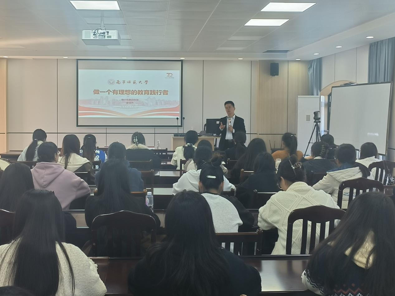 廖校长主要从“我们的初心”、“我们面临的困难”和“我们的理想信念”三个方面开展报告。首先,廖克杰校长向在场同学介绍了自己任职的南宁四中的风采和发展,为同学们树立了美好愿景。然后,廖校长介绍学校学生主要面临的问题,如作业多,压力大等,提醒在场师范生,必须以生为本,重视班主任工作。廖校长鞭策在场同学,告诫他们应提高自身知识水平和教学水准。最后,廖校长介绍课堂的常规方法步骤,通过播放自己教育学生的工作视频,为在场同学树立了正确的教学榜样。