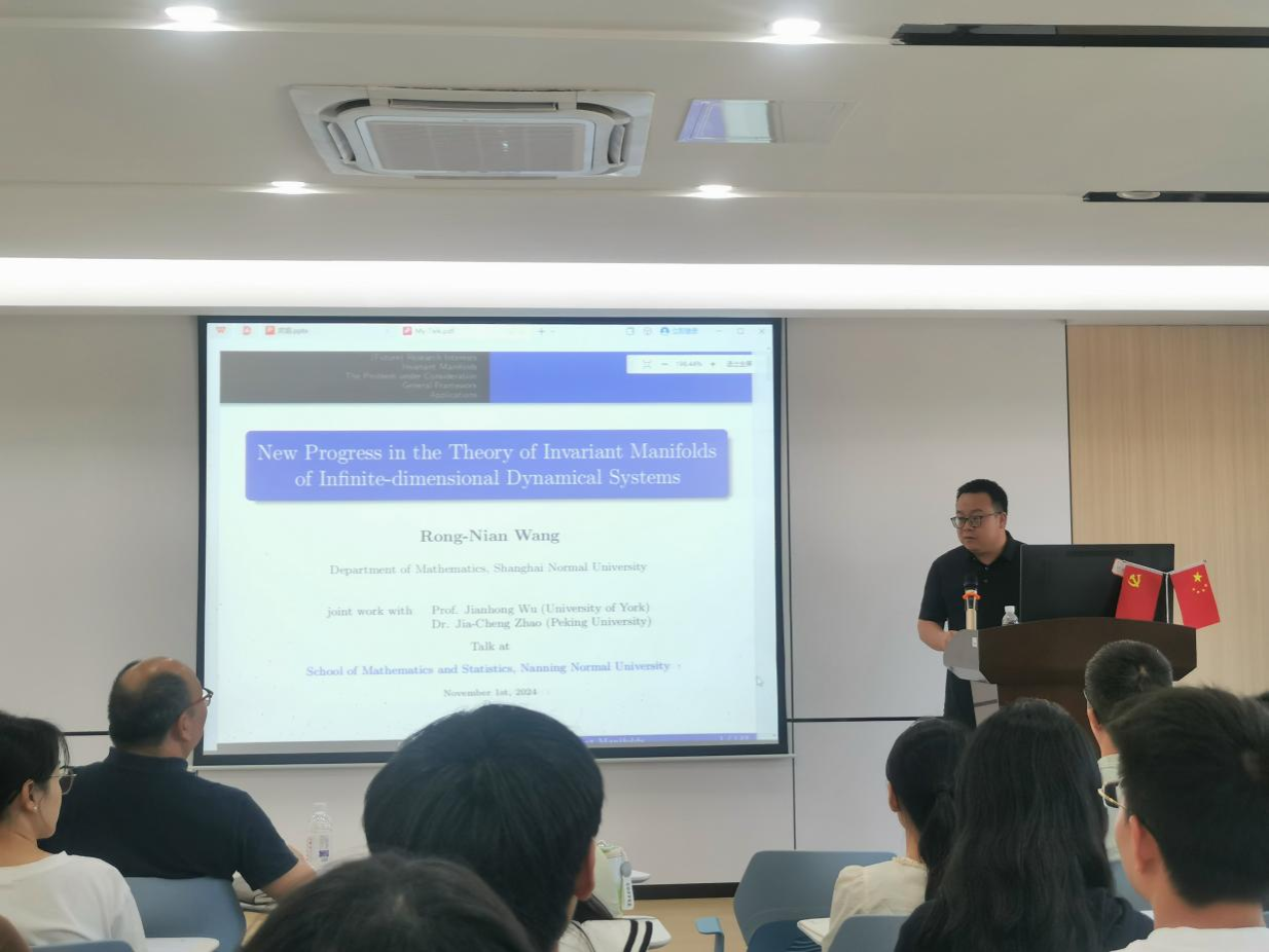 2024年11月1日,应广西应用数学中心(BWIN必赢)的邀请,上海师范大学王荣年教授为BWIN必赢师生作了题目为《New Progress in the Theory of Invariant Manifolds of Infinite-dimensional Dynamical Systems》的学术报告,报告由院长黄在堂教授主持,部分老师及所有学术型硕士研究生参加了此次学术活动。