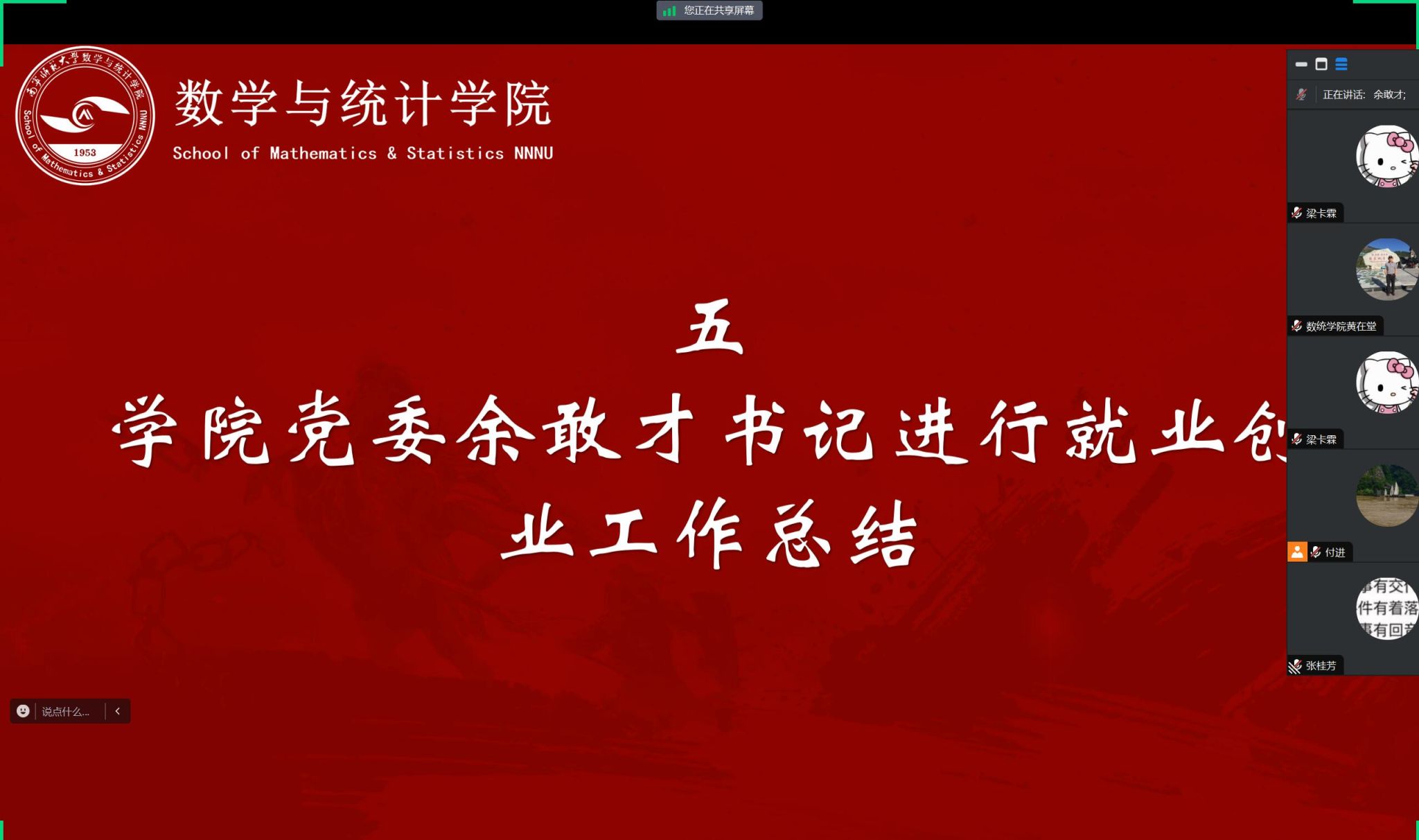 最后,该院党委余敢才书记进行总结讲话,强调在接下来的该院就业创业工作中,要做到以下三个方面的工作。一是了解毕业生就业创业异常艰难的大背景,聚焦重点难点关键点:在了解学校和该院整体的就业创业工作的基本情况后,需要进一步提高紧迫感,聚焦难点重点抓关键环节,如专科的就业形势较为严峻,就要加大力度推进。做到研究生就业要起到带动作用,本科层次就业要起到拉动作用,专科层次不拖后腿,严格按照学校既定目标要求。二是要继续吹哨子:该院就业创业工作进入攻坚克难的阶段,就业指导老师们要继续动起来,主动积极、贴心温情的帮助未就业学生。三是就业指导要分类有别,个案有策:即就业指导老师们指导学生就业时,要分层分类,想就业就有岗位信息,有岗位信息就要对应未就业学生,积极推动有意愿就业的学生就业,帮助无计划的学生规划等,做到有方法、有策略。
