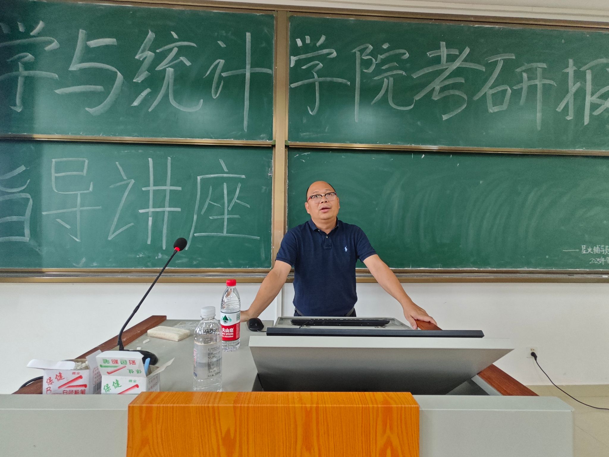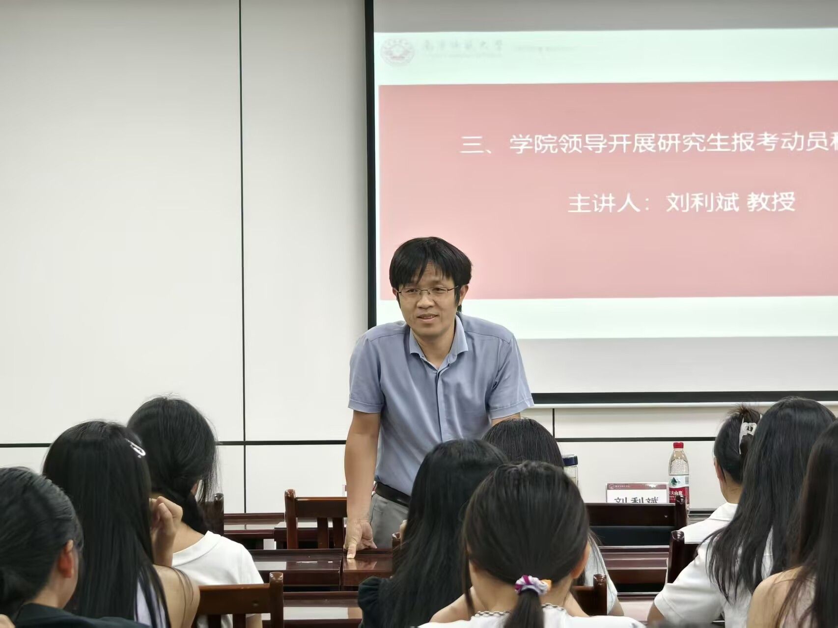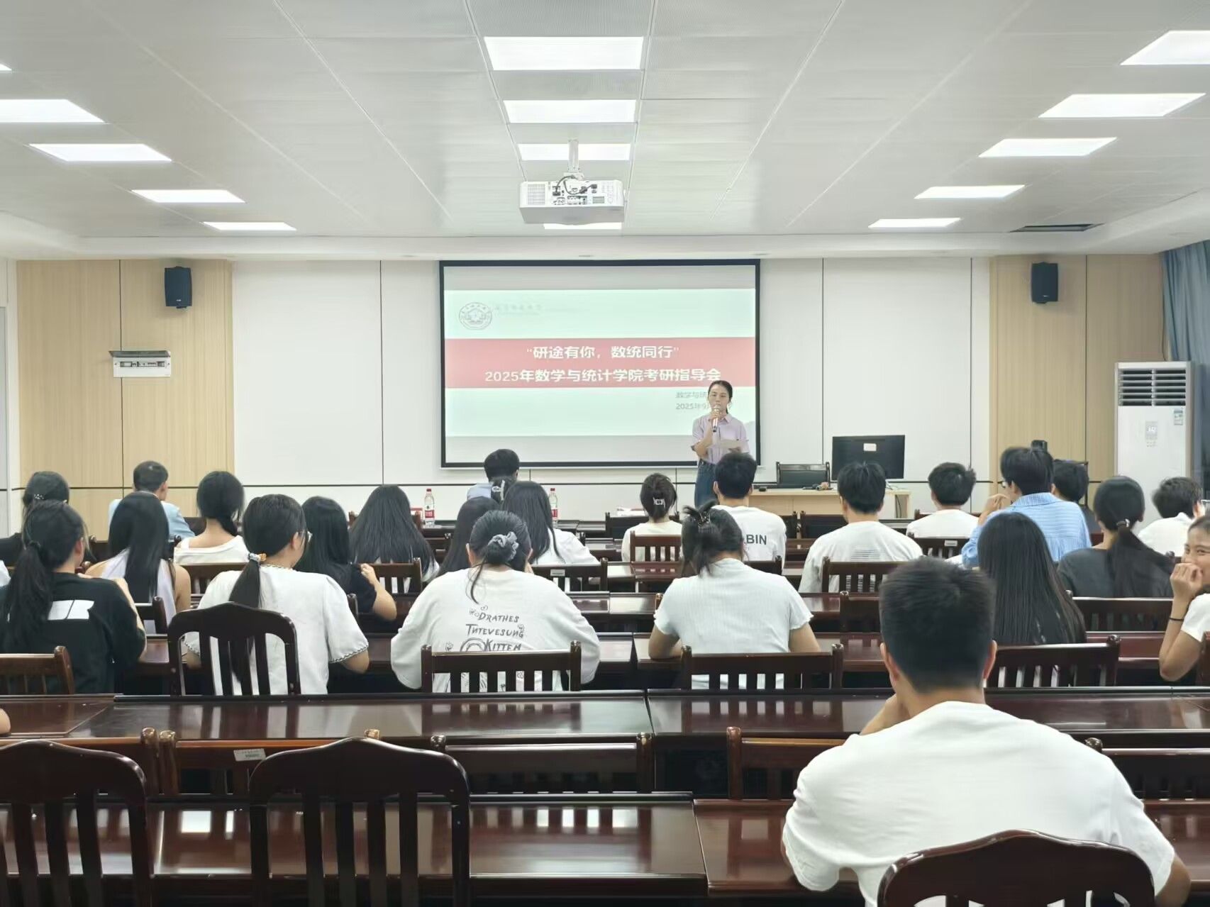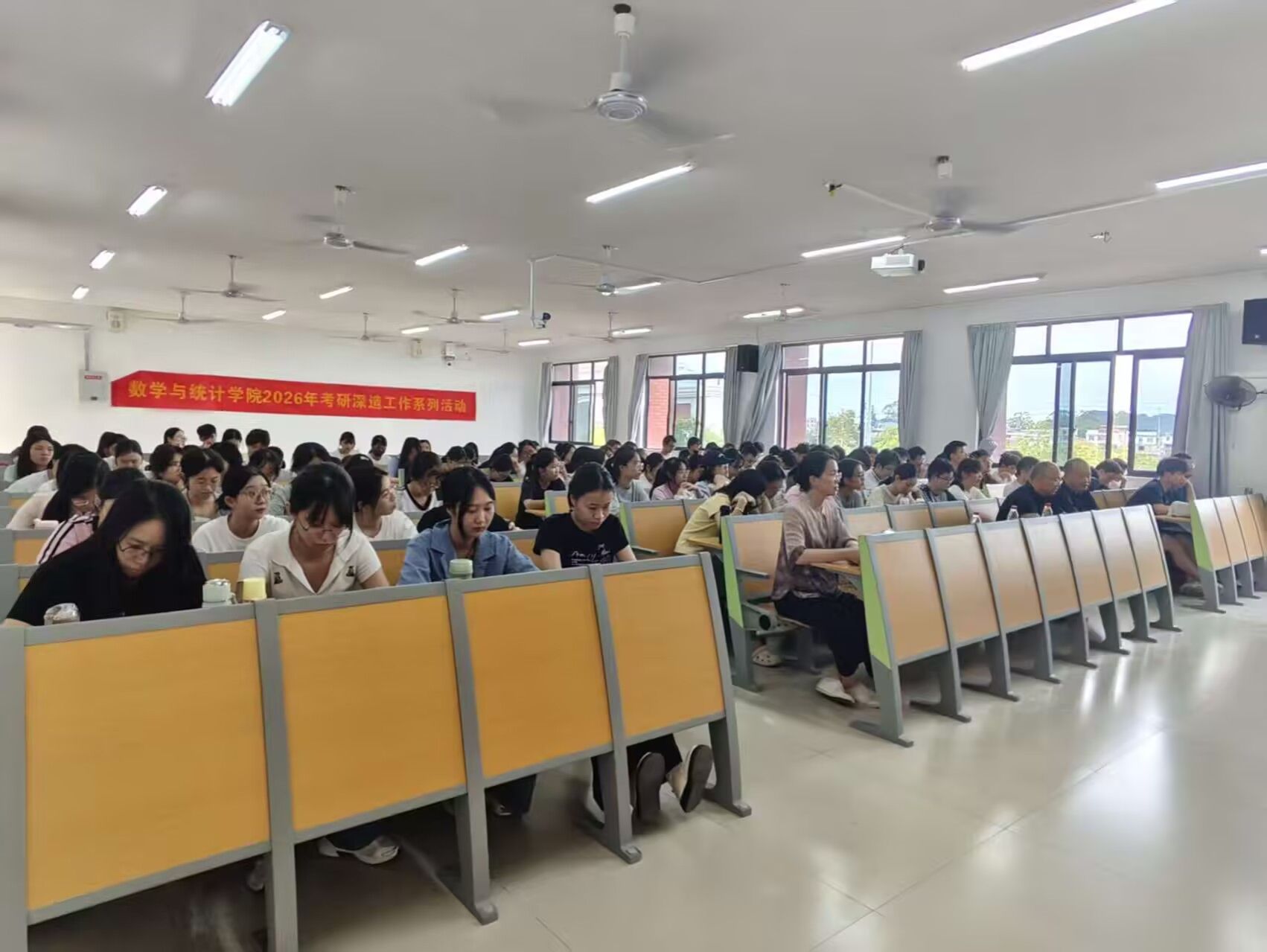 在第一阶段就业动员环节,学院团委书记梁卡霖和辅导员滕容梅分别给数学与应用数学(师范)专业和应用统计学、金融数学专业学生开展就业形势分析、就业技能技巧指导、考研政策解读以及就业工作时间安排等内容的就业动员工作,并结合当前就业市场对数学类人才的需求特点,强调提升实践能力和跨学科应用能力的重要性,鼓励学生拓宽就业视野,积极关注教育、金融、数据分析等多领域的就业机会。 第二阶段的考研指导讲座中,刘利斌副院长通过列举往届学生考研的真实案例,既有成功上岸的经验借鉴,也有失利的教训反思,让学生直观了解考研历程。韦扬江副院长着重强调学历的重要性,通过具体论述让学生认识到提升学历对个人发展的关键作用,帮助学生树立正确的考研认知。黄在堂院长从长远发展视角出发,深入剖析职业发展与学历提升的关联,对比不同学历的发展优势,清晰阐述学科深造对拓宽未来选择权的重要性。此外,他还结合本校区位优势,为学生规划考研方向提供参考,并给出实用备考建议:一是制定合理学习计划,让学习有动力、有方向,节省时间提升效率;二是调整学习方法,紧扣考试大纲针对性复习重难点;三是保持良好心态与健康生活习惯,为备考续航。